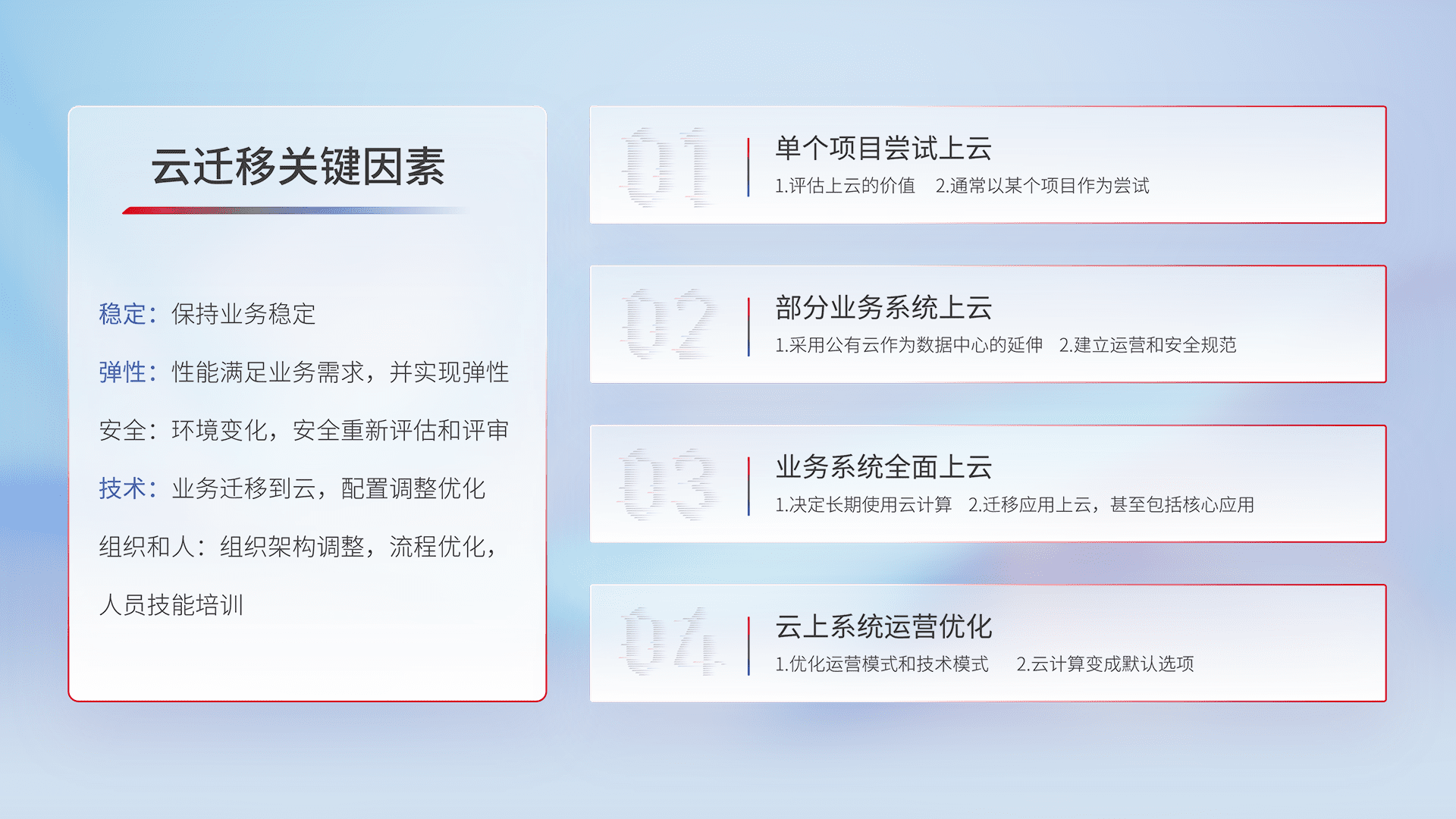 结合实际业务,,,,从规划设计、、、、云平台选型、、、、云原生改造、、、、数据迁移、、、、集成交付,,迁移全过程为客户识别最佳上云路径,,,,做好风险识别管理,,,设计网络架构、、身份权限、、、安全审计合规、、、、操作审计、、、、日志审计、、、、监控告警策略、、多站点容灾设计等,,,,对云上基础设施进行整体规划,,提升IT治理水平,,以满足弹性、、、、高可用、、、高性能的需求。。。。