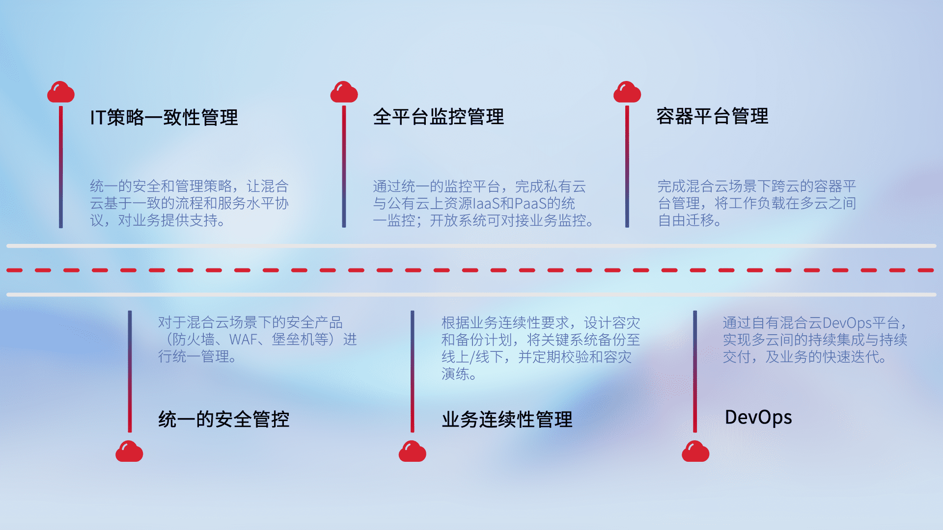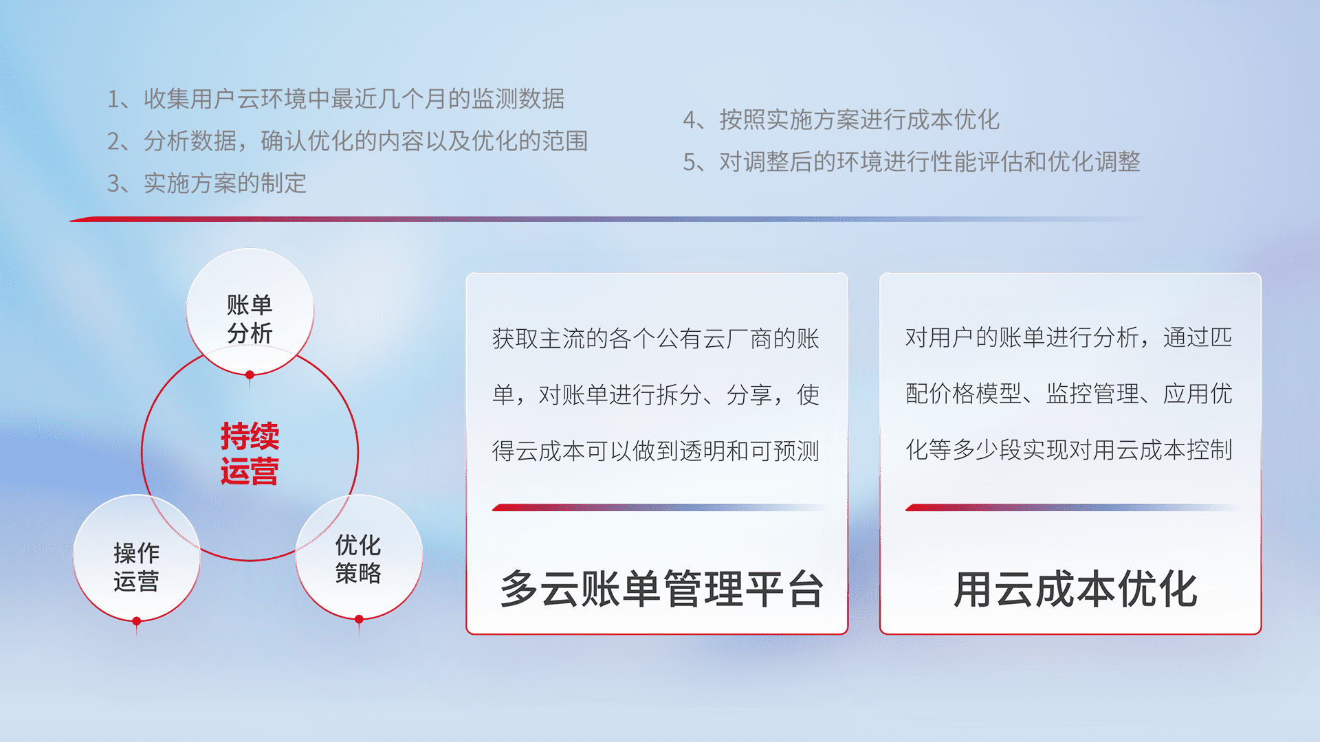 通过多云纳管,,,,以统一的资源数据模型把客户的云资源进行抽象和封装,,,进而实现对多云资源的统一操作,,保障云资源管理的可靠性、、稳定性与可用性。。。量身定制化运维内容,,配置、、、开发运维、、、补丁管理、、备份、、、、监控、、、认证和访问管理、、、、审计和日常巡检等,,,保障在用云过程中的可靠度,,,,稳定度以及高可用率。。